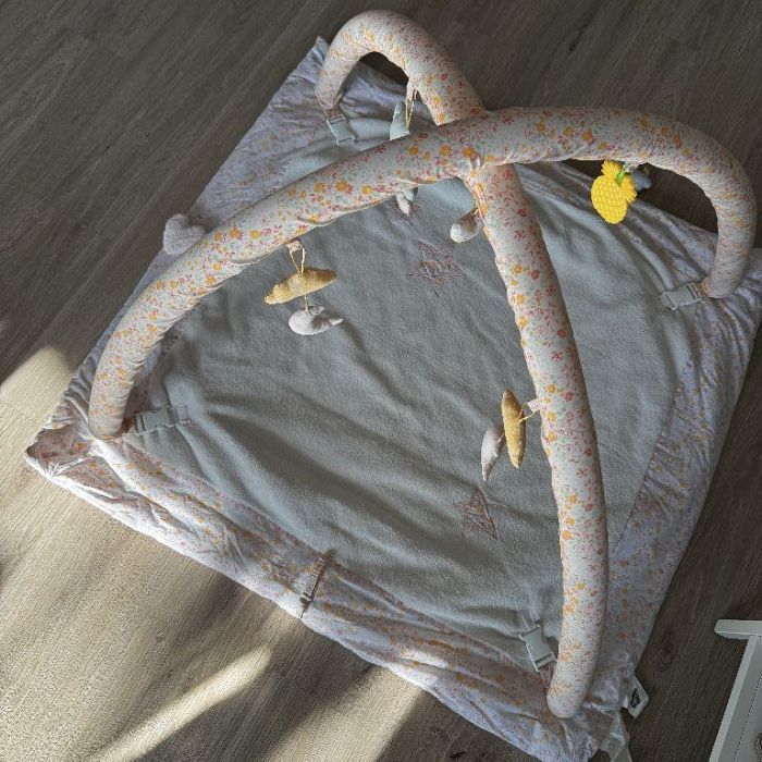 Verkaufe einen praktischen Babygym mit weichen Spielbögen in weis rosa. Die Spielmatte bietet deinem Baby eine gemütliche Unterlage zum Spielen und Entdecken.