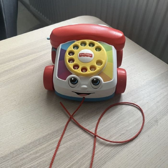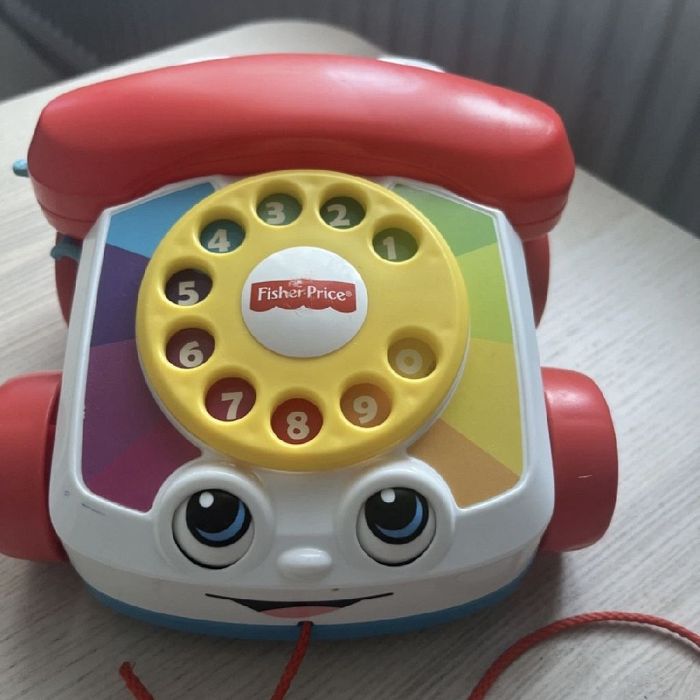 Buntes Spielzeugtelefon von Fisher-Price für Kleinkinder. Klassisches Design mit drehbarer Wählscheibe, fröhlichem Gesicht und stabiler Schnur zum Hinterherziehen. Fördert spielerisch Motorik, Farben- und Zahlenverständnis sowie Rollenspiele.
