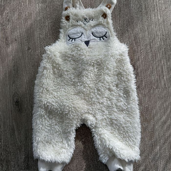 Verkaufe diesen süßen Baby-Overall in flauschigem weißem Material mit niedlichem Eulen-Design.