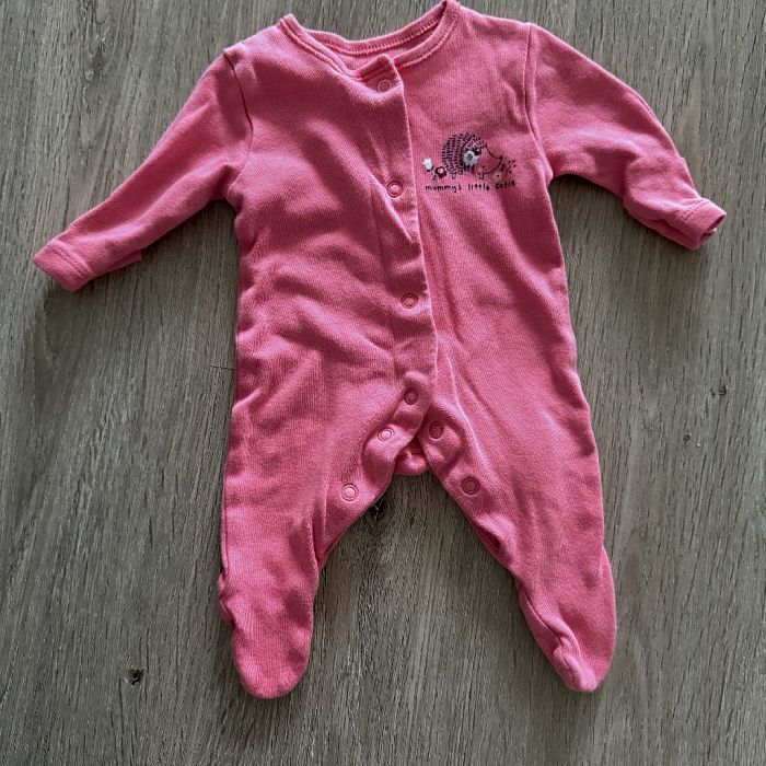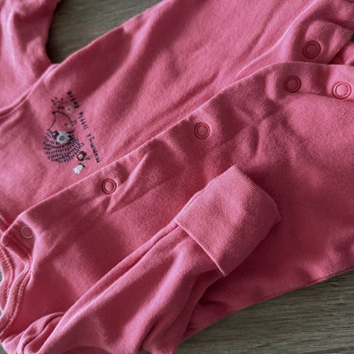 Verkaufe einen süßen rosa Baby-Strampler mit integrierten Füßchen. Der Einteiler hat lange Ärmel und eine praktische Knöpfung vorne für einfaches An- und Ausziehen.