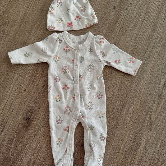 Verkaufe ein süßes Baby-Strampler-Set bestehend aus Overall und passender Mütze. Der Strampler ist in zartem Weiß gehalten mit einem niedlichen Blumenmuster in Rosa- und Grüntönen.